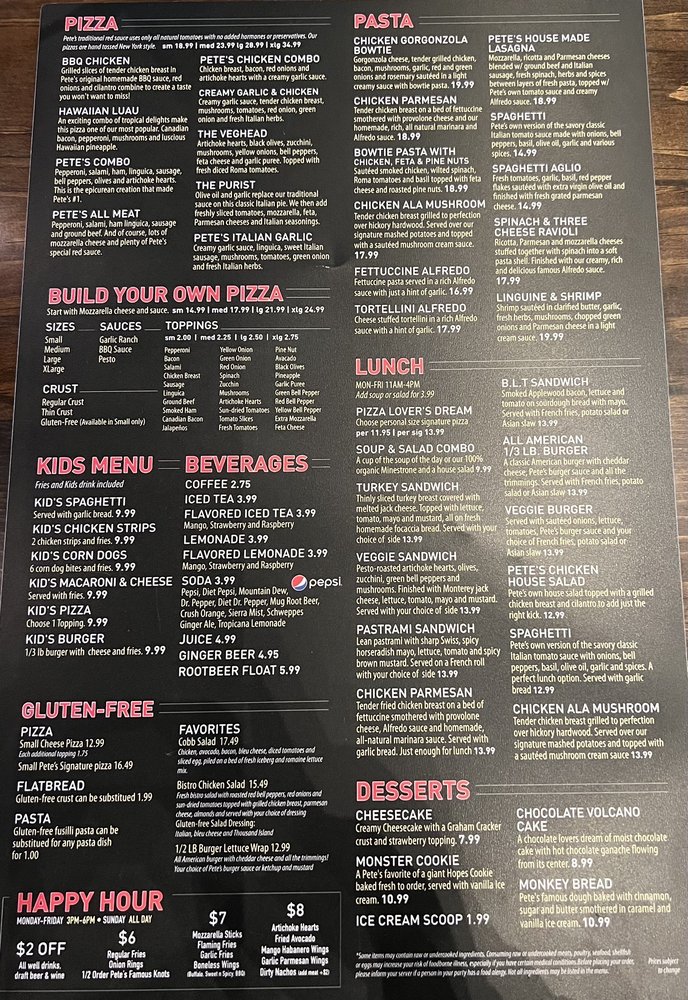 Pete's takes pride in offering a variety of options to satisfy all palates, including gluten-free and vegan selections. Start with their famous BBQ Chicken Gluten-Free Pizza or enjoy a hearty California Burger paired with garlic fries. Kids can indulge too, with a dedicated menu featuring favorites like Kids Spaghetti and Chicken Strips.